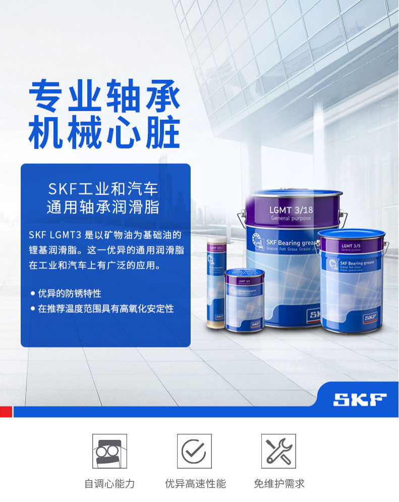 SKF工业和汽车通用轴承润滑脂 SKF LGMT3是以矿物油为基础油的锂基润滑脂。这一优异的通用润滑脂在工业和汽车上有广泛的应用。...