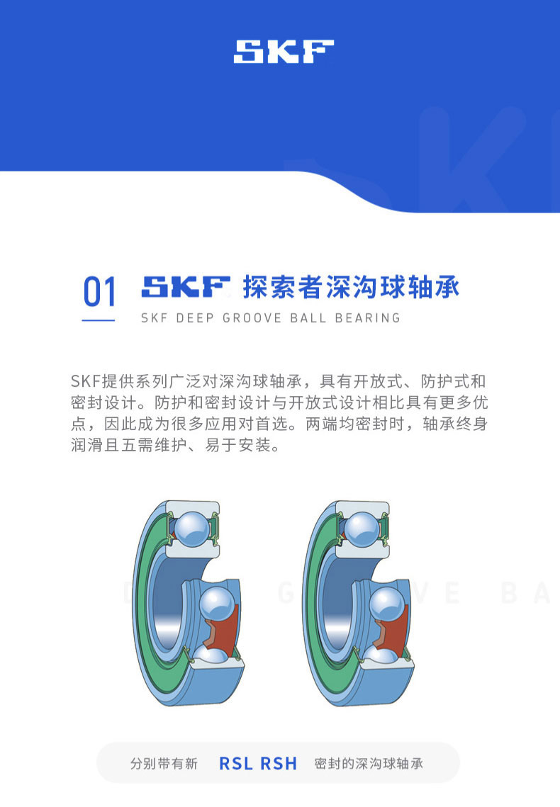 SKF深沟球轴承是一种仪器器件,有开式、双面带密封圈,带密封的轴承在外圈上开有可装密封圈或防尘盖的沟槽,适用于高转速甚至极高转速的运行。...